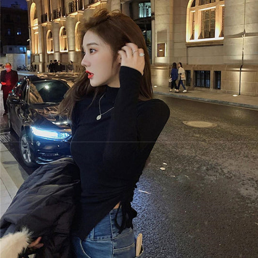 col roulé, manches longues, cordon de serrage et volants dans le bas