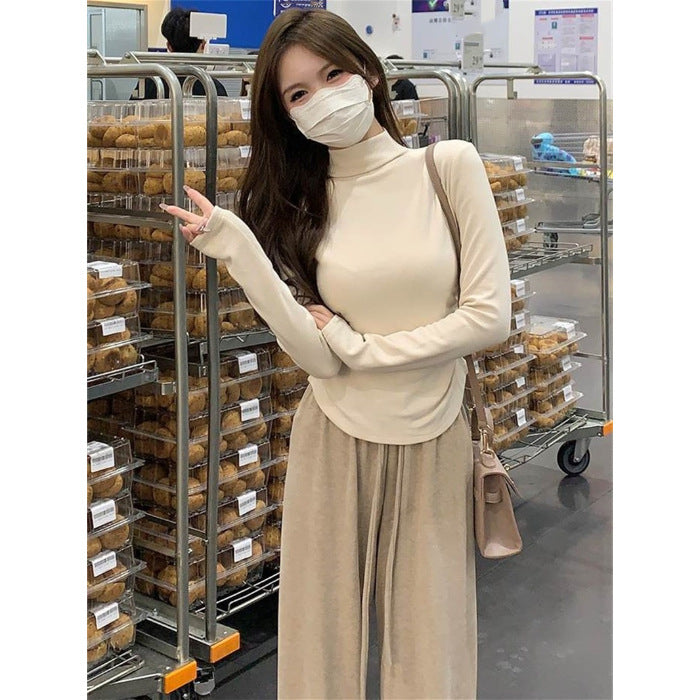col roulé, manches longues, cordon de serrage et volants dans le bas